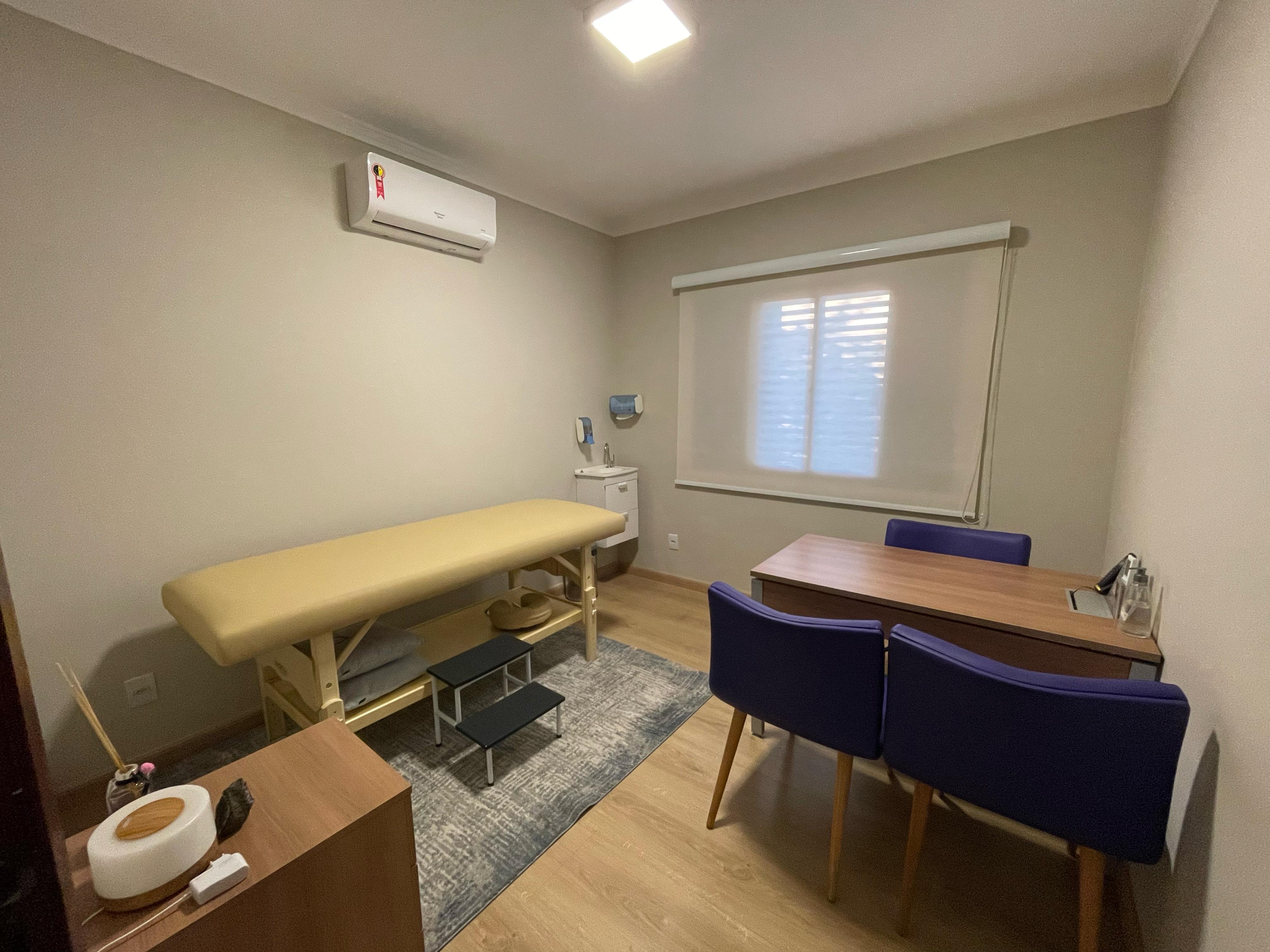 Sala para 3 pessoas, mesa de atendimento, uma cadeira giratória e 02 poltronas, maca com altura regulável, lavatório, gaveteiro de apoio, ar-cond. e Wi-Fi
