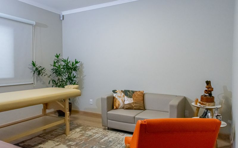 Sala de atendimento com capacidade máxima de 3 pessoas, contendo poltrona, sofá, e maca estética com altura regulável, lavatório, ramal telefônico, ar-condicionado e Wi-Fi