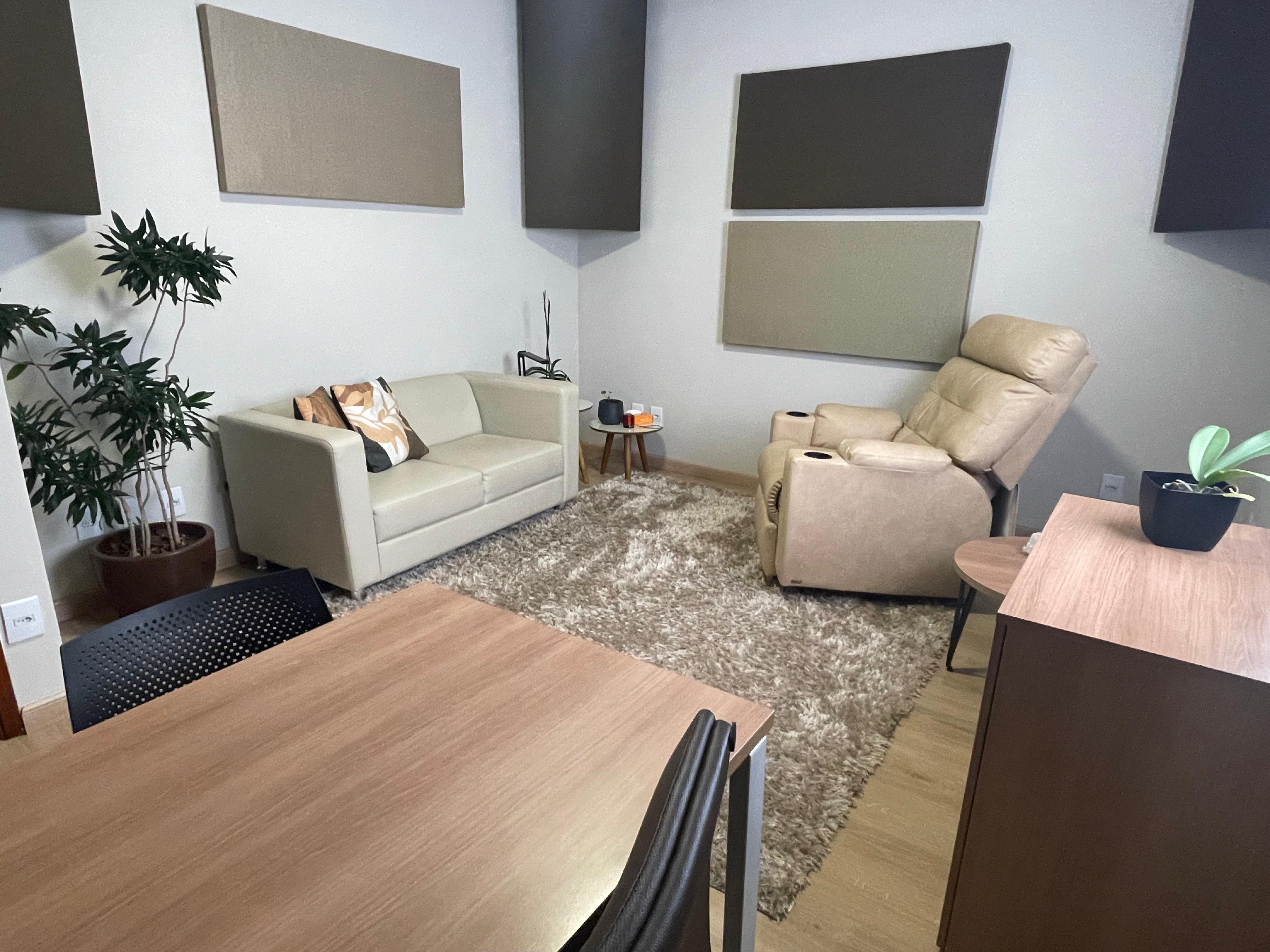 Sala de atendimento com tratamento acústico com capacidade máxima de 4 pessoas, contendo sofá, mesa com cadeira e poltrona giratória reclinável, ar-condicionado, ramal telefônico e Wi-Fi
