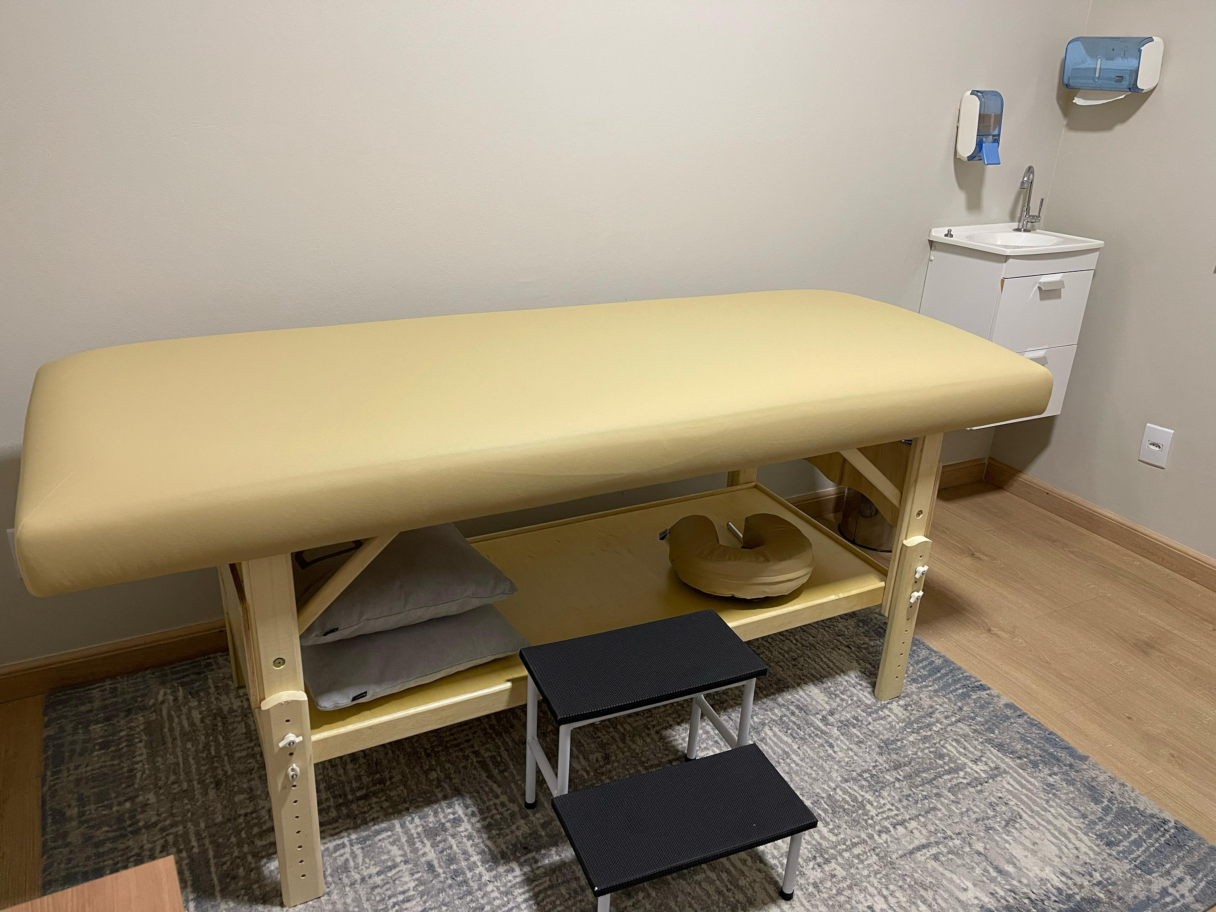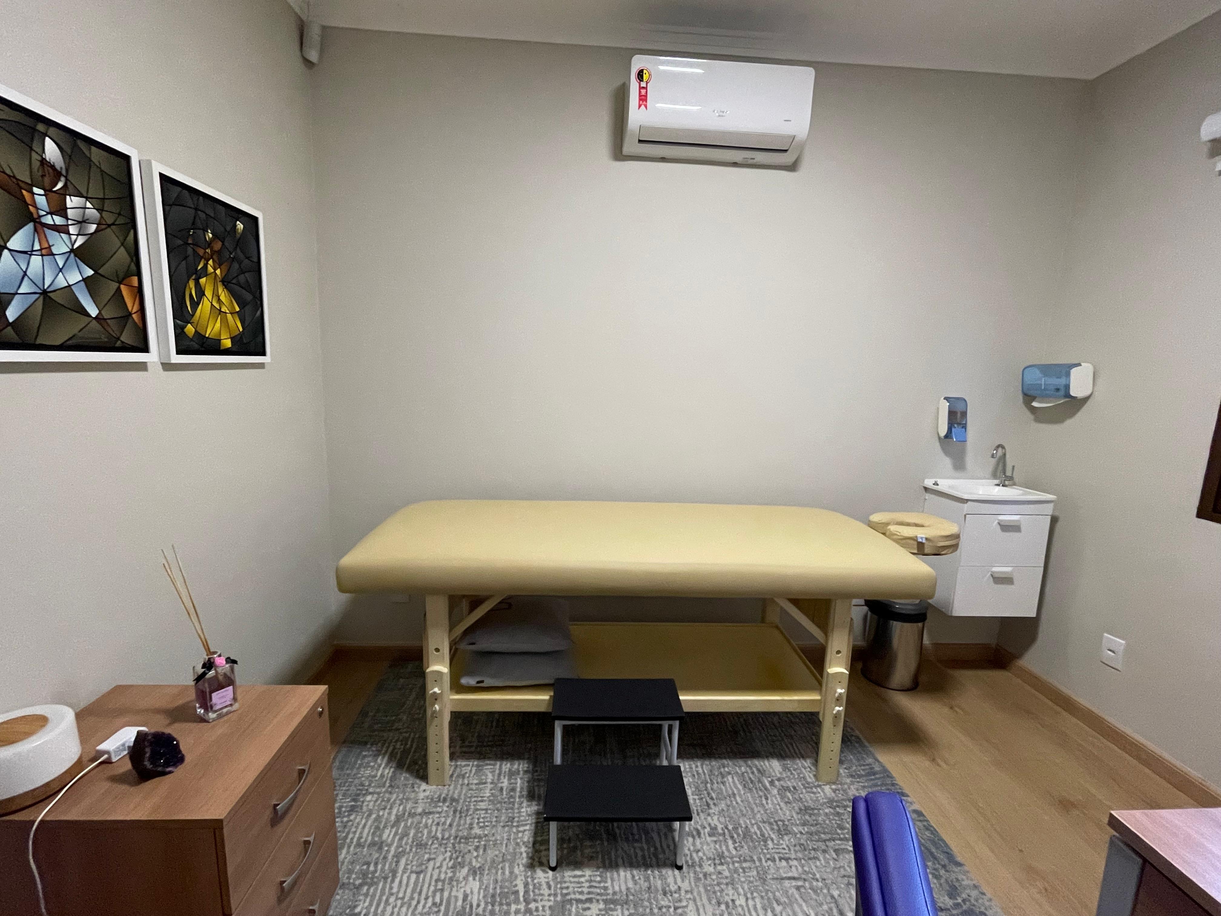 Sala de atendimento com capacidade máxima de 3 pessoas, contendo mesa de atendimento com uma cadeira giratória e 02 poltronas, maca com altura regulável, lavatório, gaveteiro de apoio, ar-condicionado e Wi-Fi.